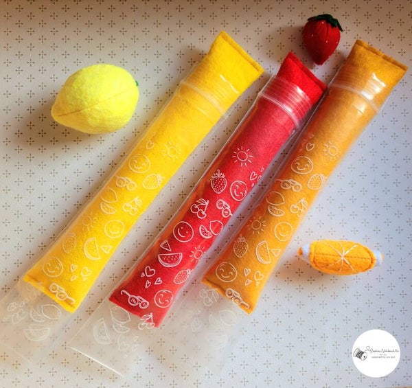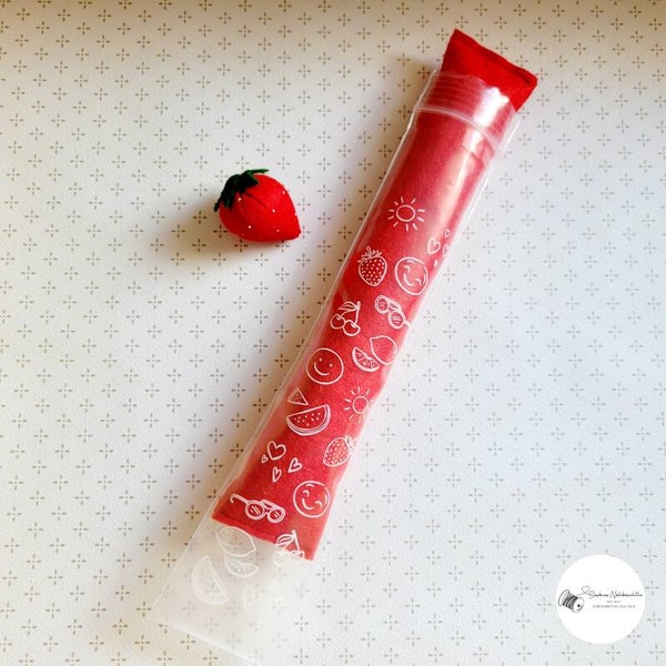 Authentisch gestaltetes Wassereis aus rotem, orangfarbenem oder gelbem Filz. Zum Verwechseln ähnlich mit dem Original. In echter Wassereishülle. Das "Eis" kann aus der Hülle genommen werden.