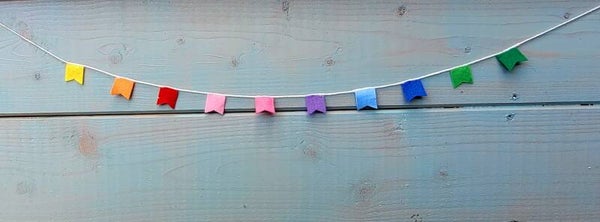 Mini-Wimpelkette als Dekoration für die Kinderküche, den Kaufladen oder einfach so. Die Wimpelkette ist 80-85cm lang und trägt 10 verschieden farbige Wimpel. Sie eignet sich hervorragend als Deko - auch in Mamas Küche, über dem Esszimmertisch, über dem Kinderbett, ...