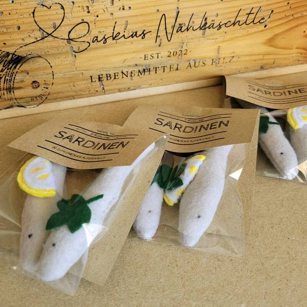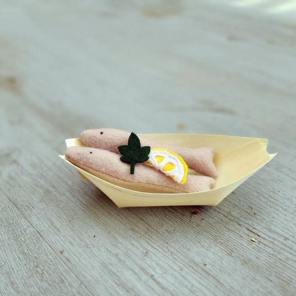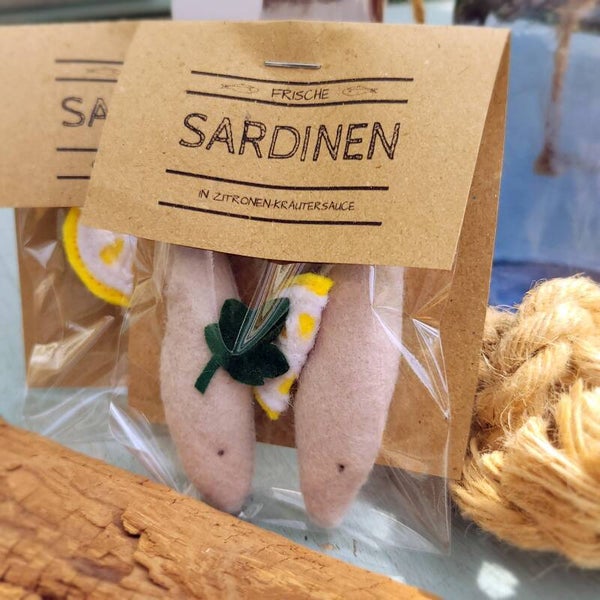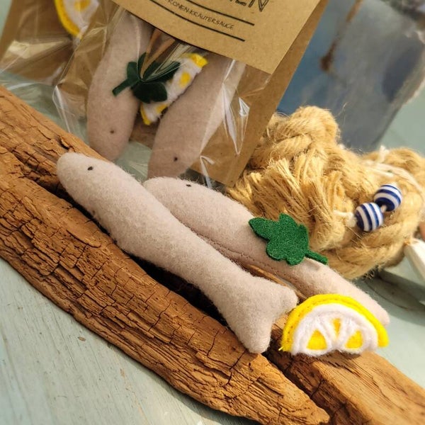 Zwei Sardinen aus beige-grauem Filz mit Zitronenhälfte und Petersilienblatt. Die Sardinen passen in kleine Kochtöpfe und Pfannen und eignen sich somit hervorragend für das kreative Spiel in der Kinderküche. Durch die liebevoll gestaltete Verpackung eignen sich die Sardinen ebenfalls für den Kaufladen.