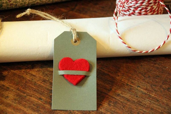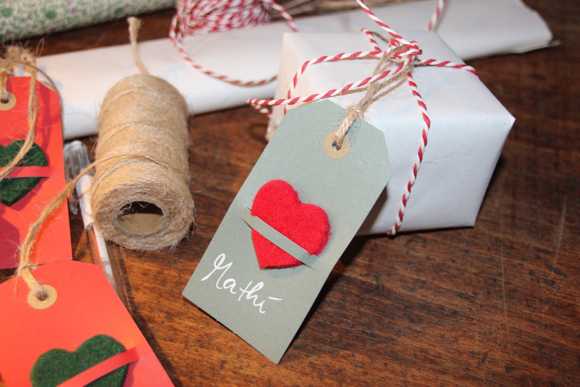 Geschenkanhänger aus Kraftpapier an Kordel zum Beschriften mit eingestecktem Herz aus rotem oder grünem Filz