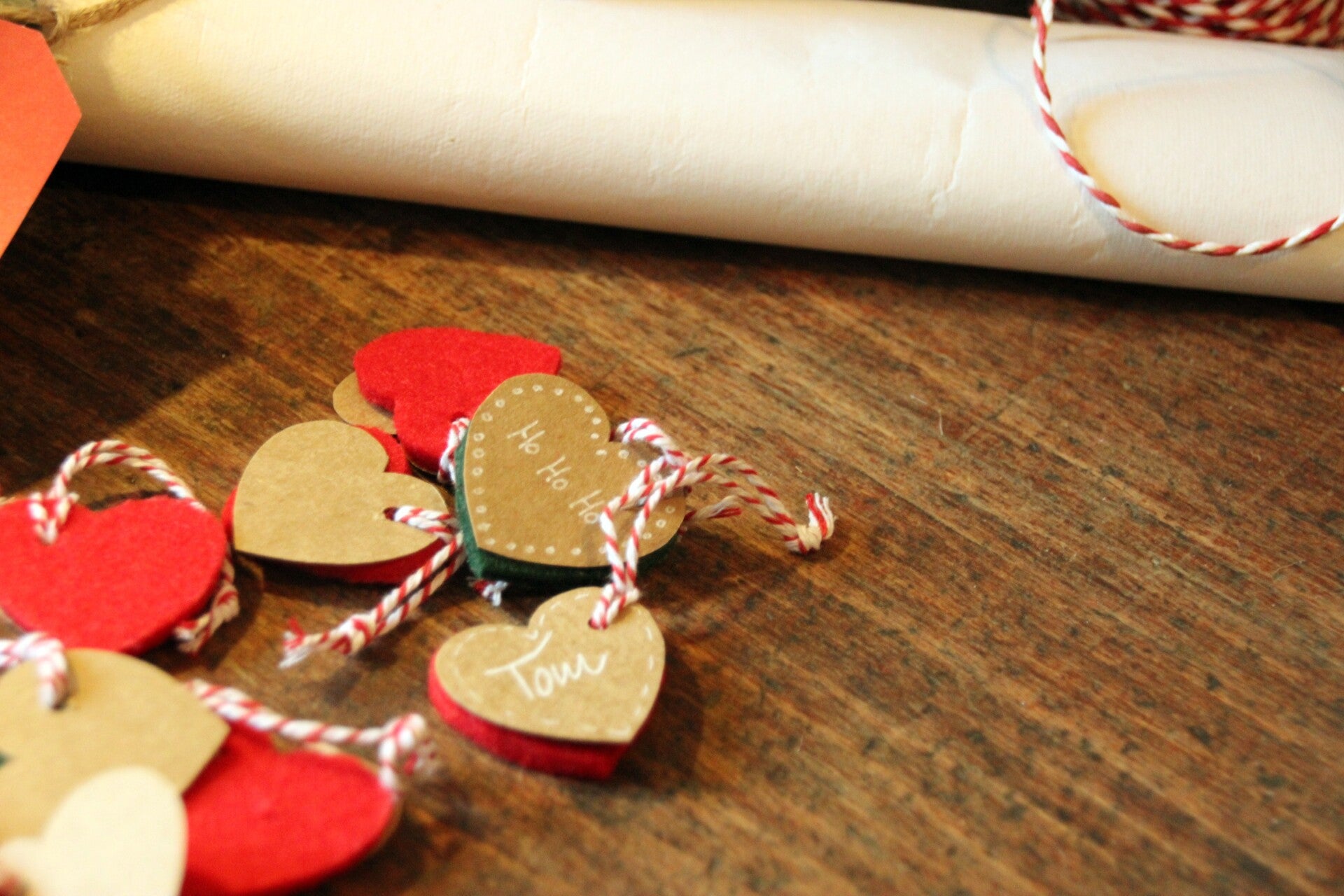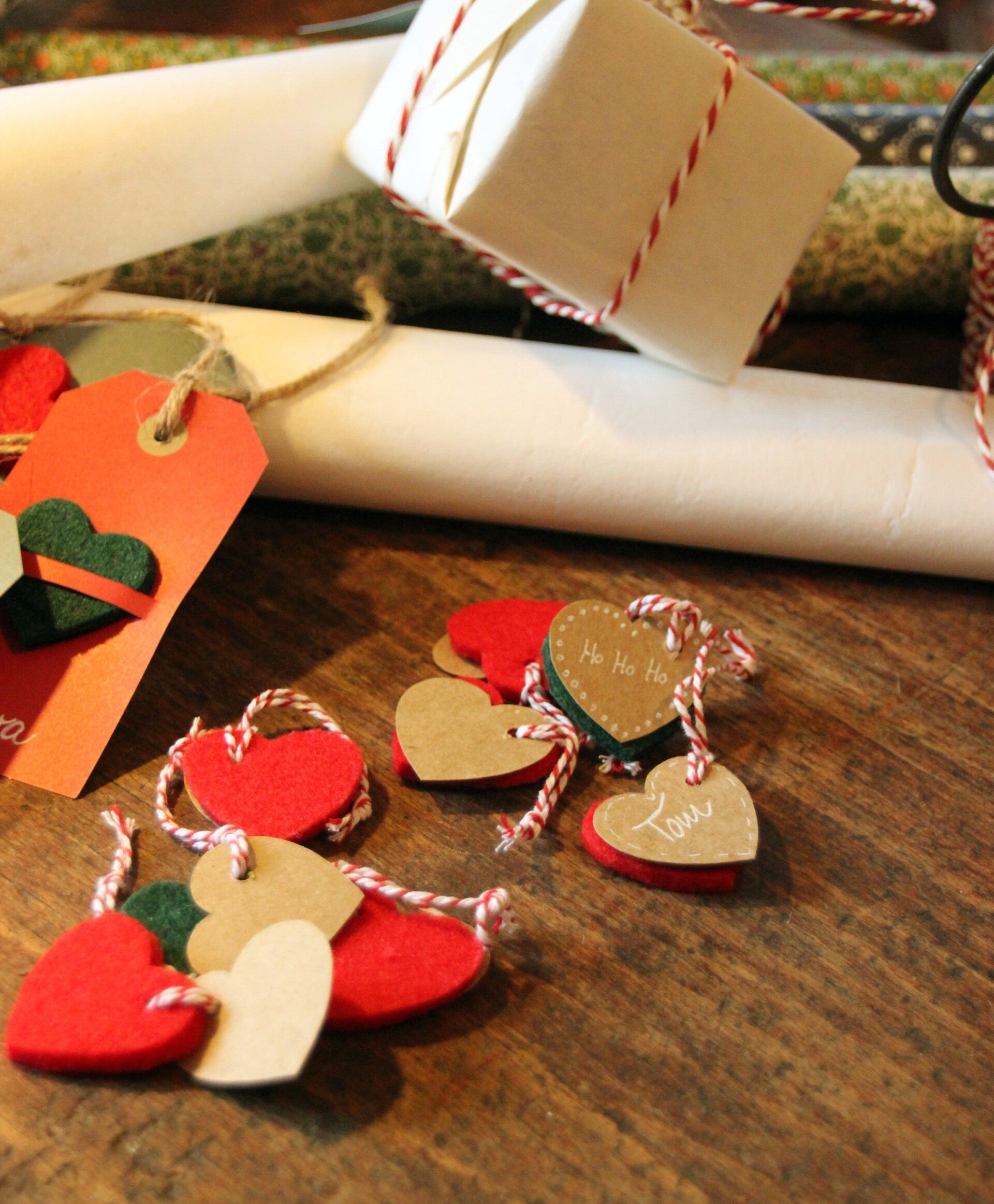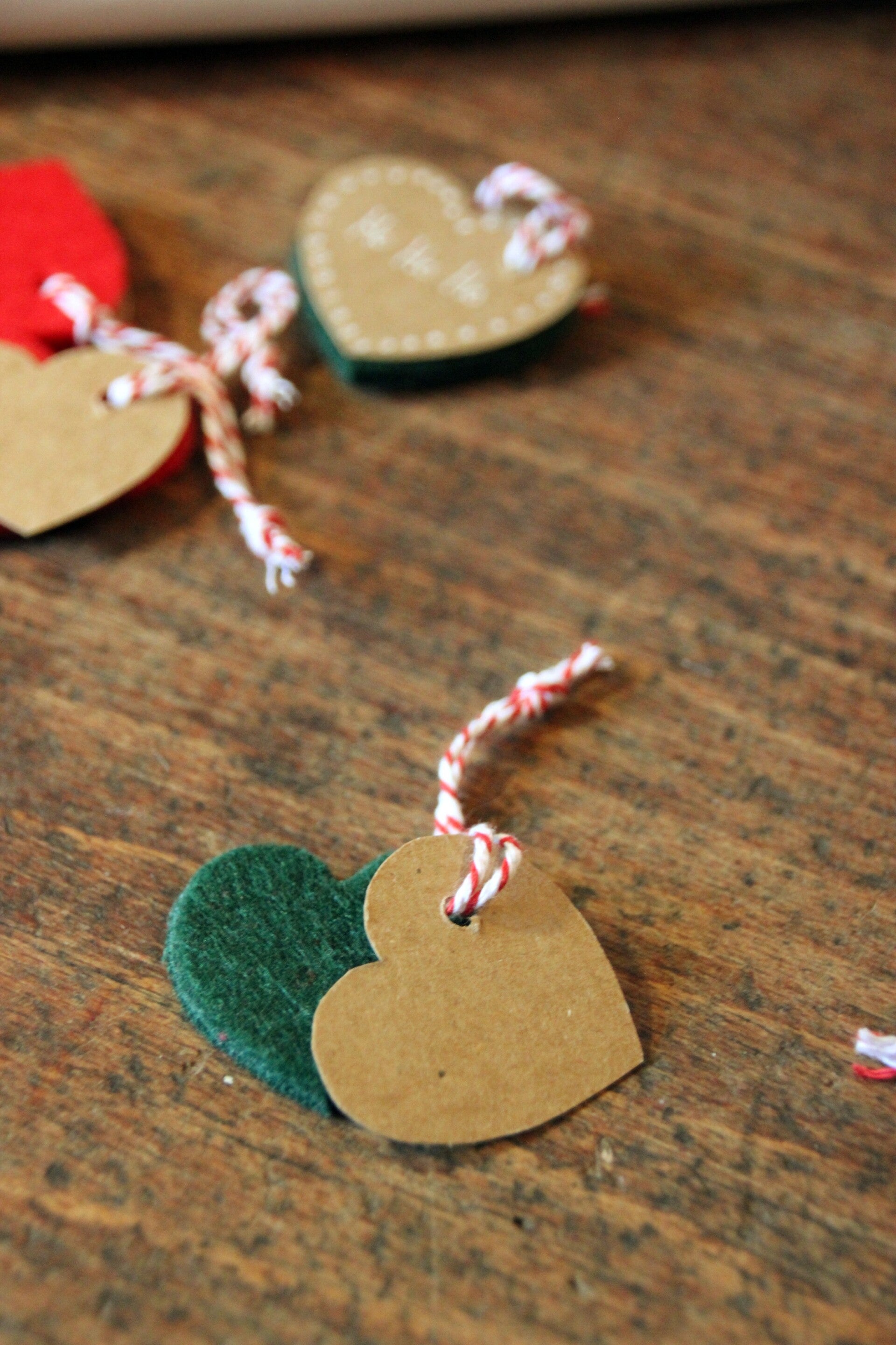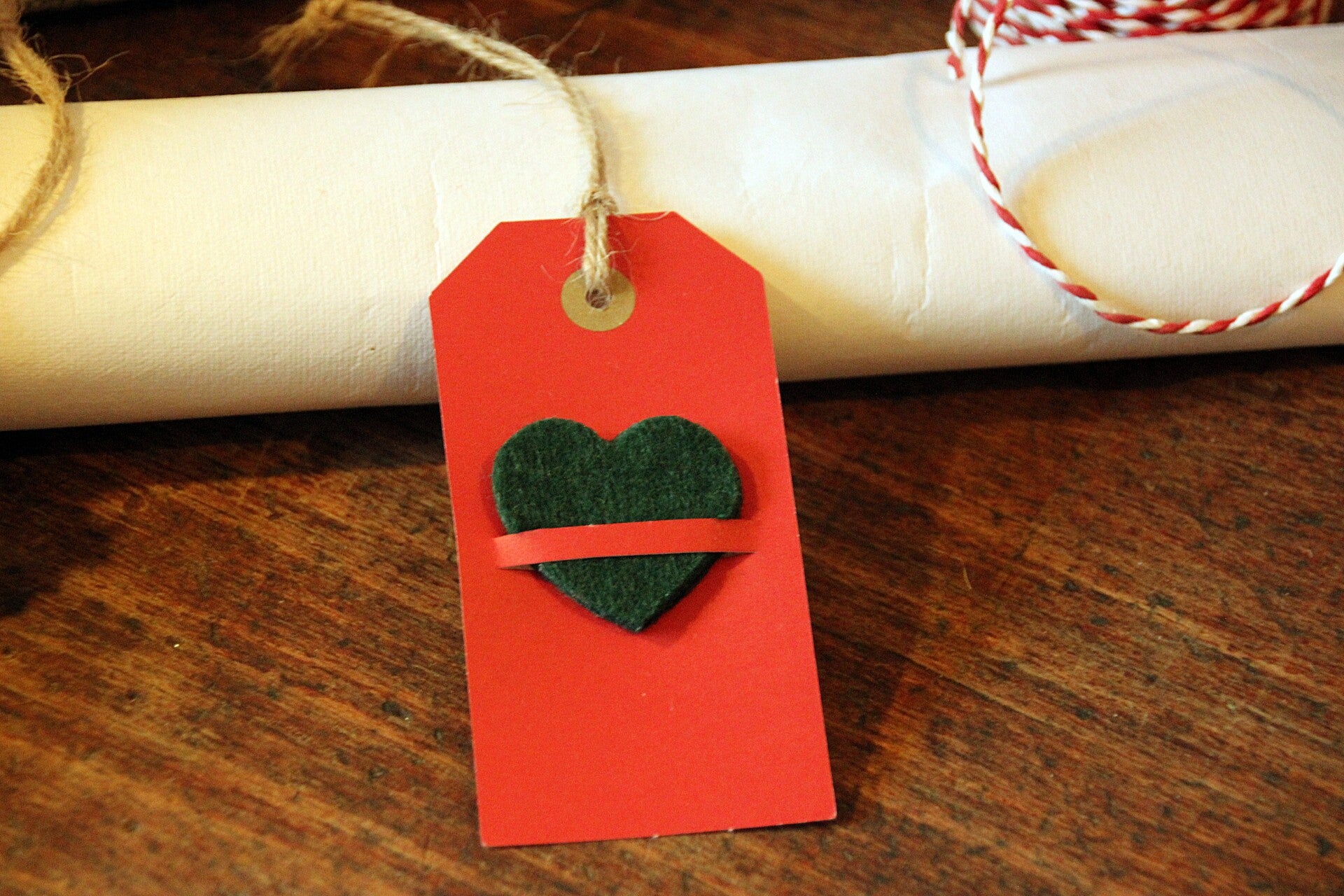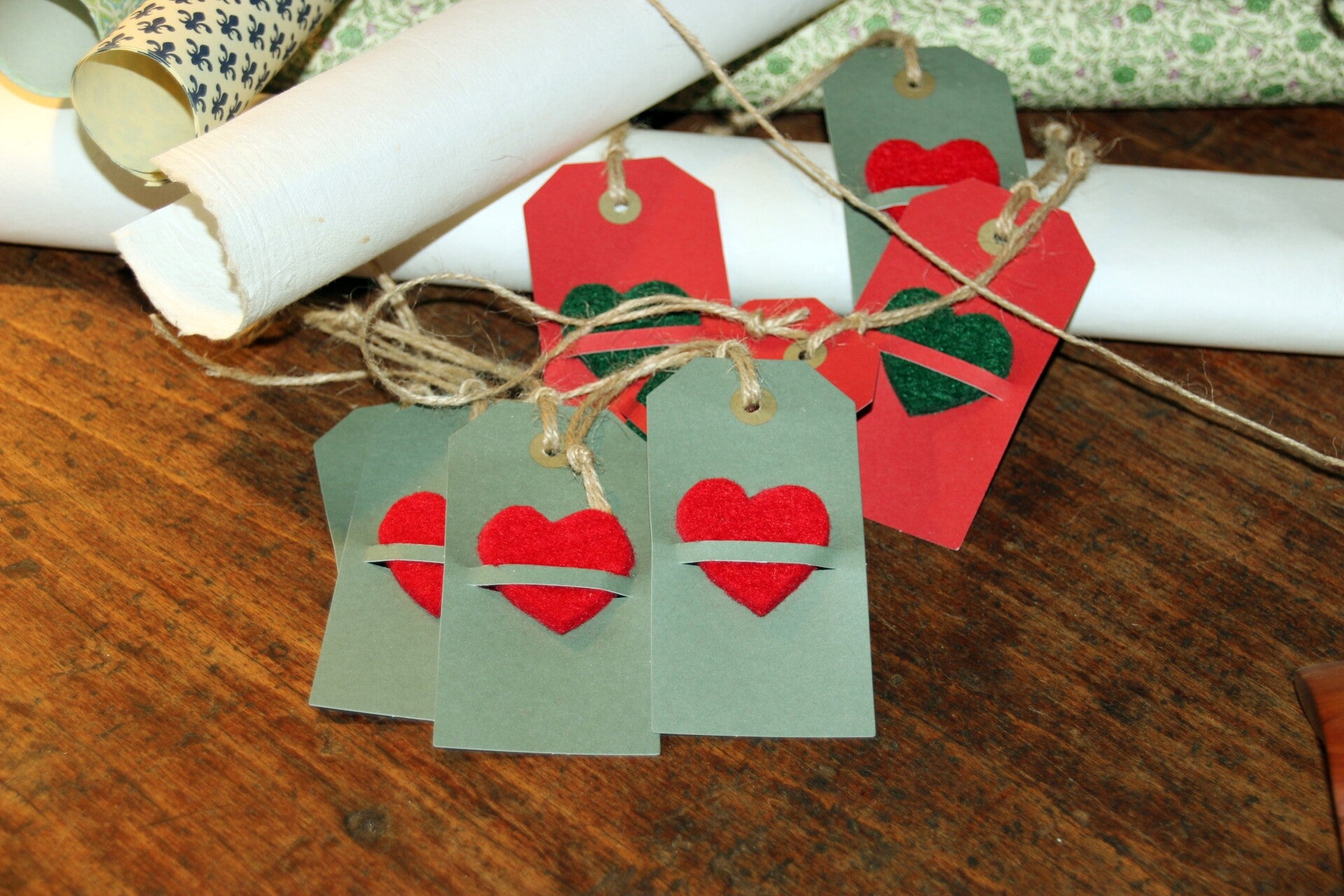 Geschenkanhänger in Herzform aus rotem oder grünem Filz in mit Kraftpapieretikett in Herzform zum Beschriften an Kordel